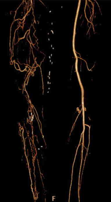Figura 2: angio-TC di paziente con occlusione femorale superficiale e poplitea dx (ricostruzione 3D volume rendering).