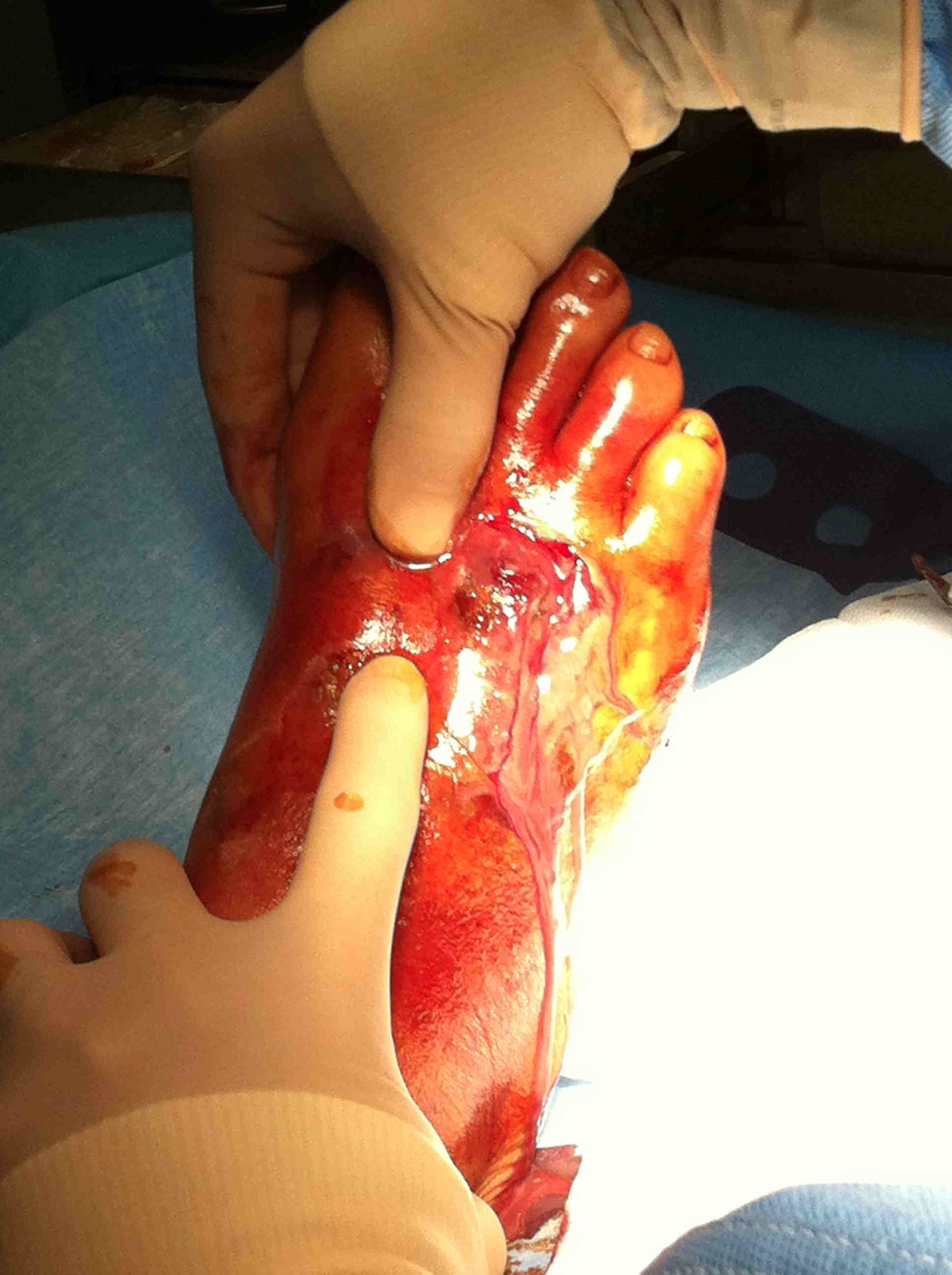 Ogni volta che si è in presenza di infezione, è opportuno trattarla in maniera aggressiva, visto che le infezioni al piede possono peggiorare rapidamente. Tutte le ferite devono essere attentamente controllate, palpate e sondate. Valutando attentamente la ferita, è necessario determinare la necessità di debridement, incisione e drenaggio o di altri interventi chirurgici. Si consiglia un intervento chirurgico urgente per infezioni del piede accompagnate da gas nei tessuti più profondi, in caso di ascesso o di fascite necrotizzante.